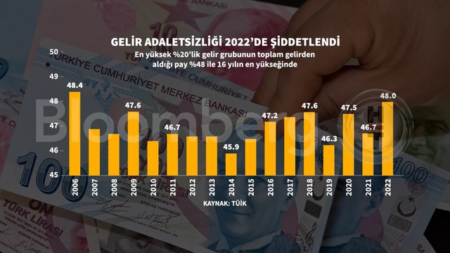 En yüksek gelire sahip olan yüzde 20'lik kesim TÜİK veri seti için 2006 yılında yüzde 48,4'lük pay almıştı. Onu takip yıllar içinde aldığı payda düşüş eğilimi görülen yüzde 20'lik kesim, 2022 yılında toplam gelirden aldığı yüzde 48'lik payla 16 yılın ardından en yüksek payı almış oldu.