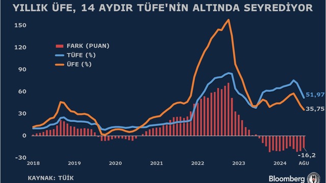Üretici fiyat artışıyla tüketici fiyat artışı arasındaki makas Ağustos ayında da devam etti. Ağustos ayıyla birlikte yıllık üretici enflasyonunun yıllık tüketici enflasyonu altındaki seyri 14. aya yükseldi.