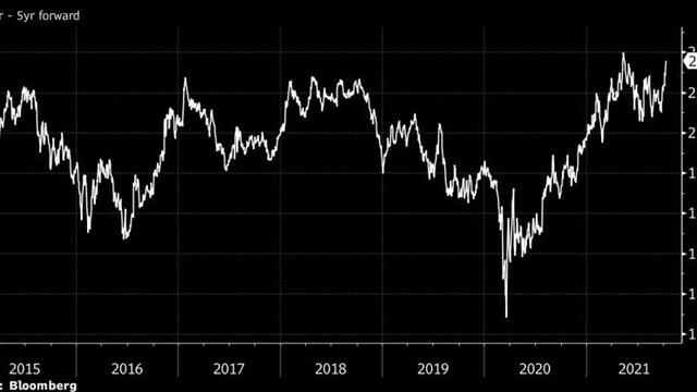5y5y forward, beş yıl içinde başlayan beş yıllık zaman çerçevesi için beklenen enflasyonu ölçer. Bu uzun vadeli ölçüm olarak biliniyor ve bu ölçüm şu anda yedi yılın en yüksek seviyesinde seyrediyor.