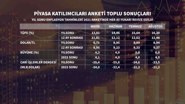 Türkiye Cumhuriyet Merkez Bankası Ağustos ayına ilişkin Piyasa Katılımcılar Anketi'ni yayımladı. Buna göre piyasanın yıl sonu enflasyon beklentisi yüzde 15,64'ten yüzde 16,30'a yükseldi. Temmuz'da yıllık enflasyon yüzde 18,95 ile 26 ayın en yüksek seviyesine çıkmıştı.