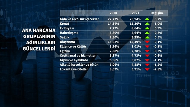 2020'de sepette yüzde 22,77 olan gıdanın ağırlığı yüzde 25,94'e yükseltildi. Gıdadan sonra en büyük kalem olan ulaştırmanın ağırlığı ise yüzde 15,62'den yüzde 15,49'a düştü.