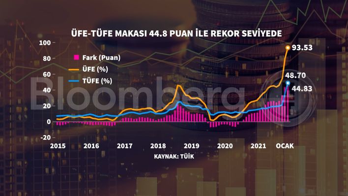 Ocak ayında üretici fiyatları da hızlandı. Verilere göre üretici fiyat endeksi yıllık bazda yüzde 93,53 arttı. Aylık bazda üretici fiyatlarındaki artış ise yüzde 10,45 olarak kaydedildi.