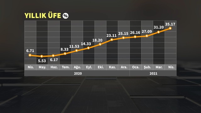 Üretici fiyatları tarafındaki yükseliş ivmesinin de devam ettiği izlendi. Buna göre üretici fiyat endeksi Nisan'da geçen yılın aynı dönemine göre yüzde 35,17 arttı. Aylık bazdaki artış ise yüzde 4,34 oldu.