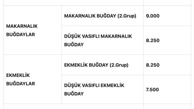 Makarnalık Buğday fiyatına kalitesine göre (1. Grup) ton başına 100 TL ilave fiyat verilecektir. Bu şekilde 1. Grup Makarnalık Buğday fiyatı ton başına 9.100 TL olacaktır.