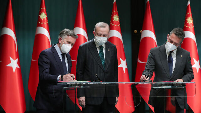 Cumhurbaşkanı Erdoğan’ın konuşmasının ardından, Ford Otosan Yönetim Kurulu Başkanı Ali Koç ve Ford Avrupa Başkanı Stuart Rowley satın alma protokolüne imza attılar.