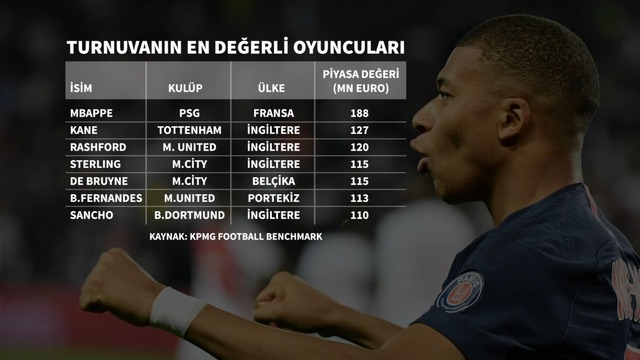 Turnuvanın en değerli oyuncuların ülkeleri ve oynadıkları kulüplere baktığımızda, İngiltere kulüplerinin ciddi oranda baskın olduğu görülüypr. KPMG Football Benchmark’ın değerlemesine göre turnuvanın en değerli 7 oyuncusunun 4’ü İngiliz asıllıyken, 5 tanesi İngiliz kulüplerinde top koşturuyor. Bu 7 oyuncunun piyasa değeri ise 888 milyon Euro ile Türkiye Süper Lig ve Holanda Ligi gibi liglerden daha değerlidir.