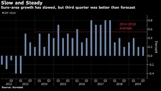 Euro Bölgesi ekonomisi üçüncü çeyrekte ekonomistlerin medyan beklentisinin üzerine çıkarak yüzde 0.2 büyüdü ve Avrupa’nın en büyük ekonomisi Almanya’nın negatif katkısıyla sanayide yaşanan düşüşe karşı direnç gösterdi.