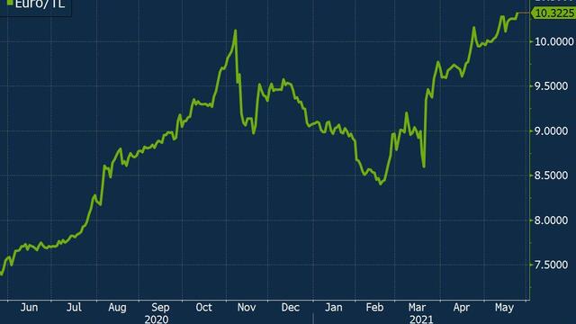 Euro/TL salı günü 10,3261 seviyesine ulaşarak tüm zamanların en yüksek seviyesini gördü. Fed politikacılarından gelen enflasyon yorumları sonrasında ABD Hazine tahvil faizi ve dolar endeksindeki düşüşe rağmen gelişen ülkelerin genelinde görülen fiyatlama Türk Lirası'na yansımadı