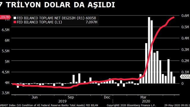 Fed'in bilanço büyüklüğü geçen hafta hafifçe artarak, önceki haftanın seviyesi olan 7.04 trilyon dolardan 7.1 trilyon dolara yükseldi. Bu, koronavirüs sürecindeki en düşük hızdaki haftalık bilanço artışı oldu. Bu artışın önemli kısmı, özel sektör tahvil alımlarını kapsayan acil kredi programlarındaki 33 milyar dolarlık artıştan geldi.