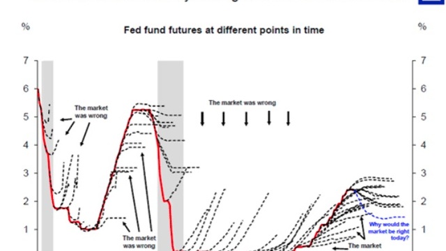Deutsche Bank baş ekonomisti Torsten Slok ve takımı “Piyasa Fed'in ne yapacağı konusunda neredeyse her zaman yanıldı.” başlıklı bu grafiği hazırladı. Kırmızı çizgi Fed fonlama oranı patikasını temsil ediyor. Kesik çizgiler ise vadeli piyasalara göre traderların fonlama faizinin yönünde ilişkin beklentilerini gösteriyor.