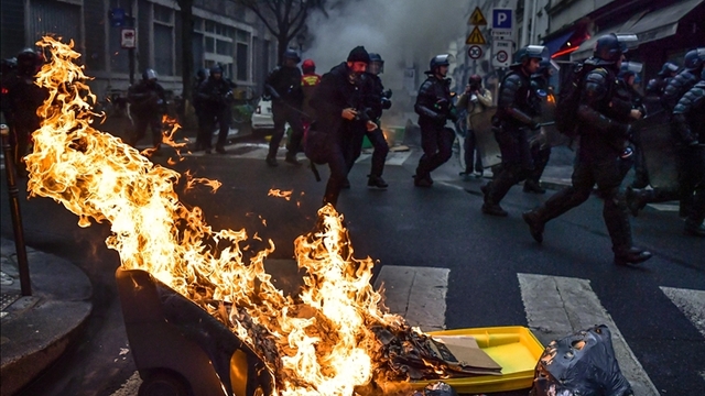 Fransada ülke genelinde farklı illerde devam eden emeklilik reformuna karşı düzenlenen gösterilere çok sayıda kişi katıldı. Başkent Pariste çok sayıda sektör çalışanı, mecliste oylamaya sunulmadan kabul edilen emeklilik reformunu protesto etti. Protestolar sırasında bir gösterici belediye binası önünde bisikletini yaktı.