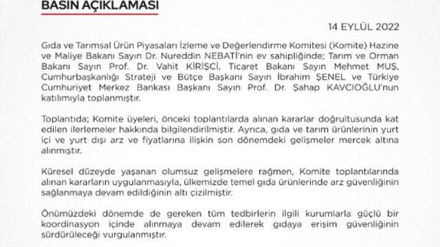 Gıda Komitesi toplantısı sonrası yapılan resmi açıklamada ise, "Tarımsal ürünlerde üretici ve hal fiyatları ile perakende fiyatları arasındaki farkın nedenleri irdelenmiş ve bu konuda ilgili taraflarca daha detaylı çalışılması için alt komite kurulması kararlaştırılmıştır" denildi.