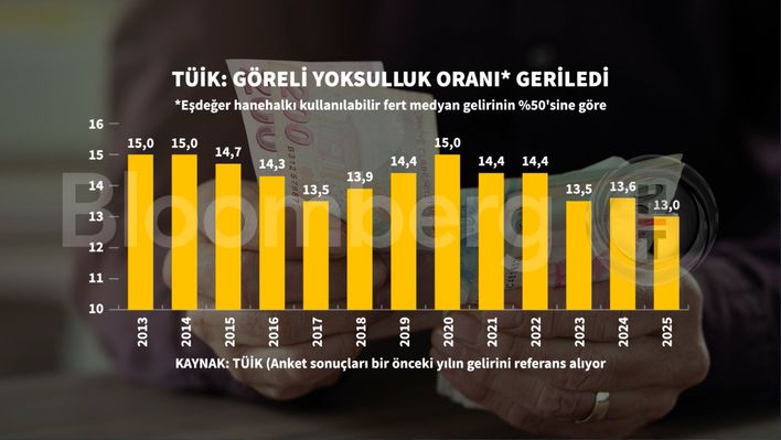 Türkiye İstatistik Kurumu (TÜİK) 2025 yılının göreli yoksulluk oarnını açıkladı. 2024 yılını referans alarak 2025 yılı sonuçlarına ilişkin bilgilere dayanan istatistikte, eşdeğer hanehalkı kullanılabilir fert medyan gelirinin yüzde 50'si dikkate alınarak belirlenen yoksulluk sınırına göre, yoksulluk oranı 2025 yılında 0,6 puan azalarak yüzde 13,0 oldu. Medyan gelirin yüzde 60'ı dikkate alınarak belirlenen yoksulluk sınırına göre hesaplanan yoksulluk oranı ise son yılda yine 0,6 puan azalarak yüzde 20,6 olarak gerçekleşti.