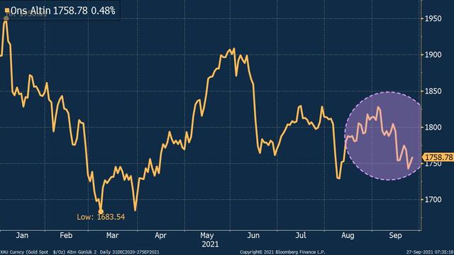 Geçen hafta Fed toplantısı öncesinde 1.785 dolara kadar yükselen ons altın, Fed’in varlık alımlarını azaltabileceğine dair verdiği mesajlar sonrasında 6 haftanın en düşüğüne gerilemişti. Evergrande endişeleriyle beraber dolar yeni haftaya düşüşle başlarken ons altın yüzde 0,5 civarında yükselişle haftaya 1.759 başladı.