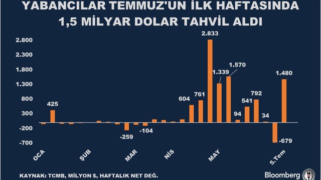 28 Haziran haftasında 679 milyon dolarlık tahvil satışı yapan yabancının 5 Temmuz haftasında 1 milyar 480,2 milyon dolarlık tahvil alımı yaptığı görüldü.