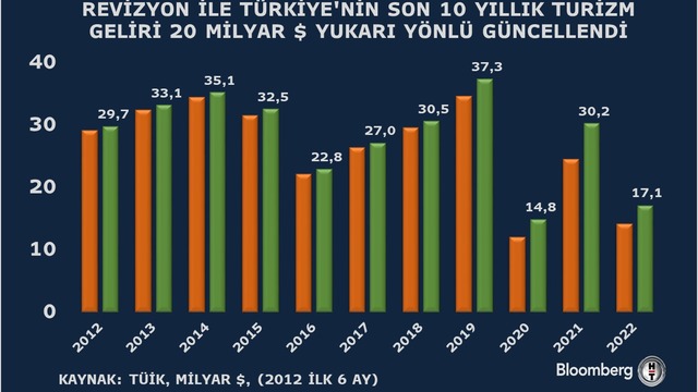TÜİK'in revizyon sonrası Türkiye'nin son 10 yıllık toplam turizm geliri yukarı yönlü 20 milyar dolar güncellendi.