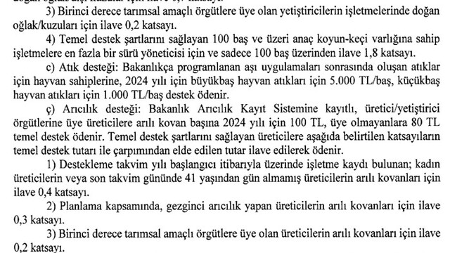 b) Damızlık Koyun/Keçi Yetiştiricileri Birliğine üye yetiştiricilerin (birlik olmayan illerde bu şart aranmaz), Bakanlıkça belirlenen aşıları tamamlanmış, yılı içinde doğan ve doğduğu işletmede en az 4 ay (120 gün) kalan oğlak/kuzularına 2024 yılı için hayvan başına 200 lira temel destek ödenir. Temel destek şartlarını sağlayan yetiştiricilere, oğlaklar ile kuzular için aşağıda belirtilen katsayıların temel destek tutarı ile çarpımından elde edilen tutar ilave edilerek ödenir.