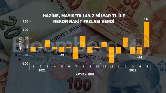 Hazine ve Maliye Bakanlığı verilerine göre Mayıs ayında Hazine 149,2 milyar tl ile rekor nakit fazlası verdi. Önceki veri 43,7 milyar lira açık şeklindeydi.