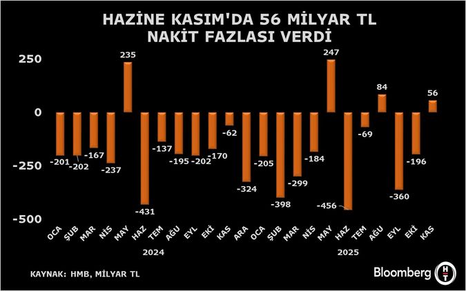 Buna göre, Hazine nakit dengesi Kasım'da 56,4 milyar TL fazla verdi. Önceki veri 195, 9 milyar TL açık şeklindeydi.