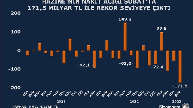 Açıklanan verilere göre, Şubat'taki 171,5 milyar TL açıkla birlikte Ocak-Şubat nakit dengesi 225,8 milyar TL açığa ulaştı. Nakit dengesi 2022 yılının Şubat ayında 55,5 milyar TL fazla vermişti.