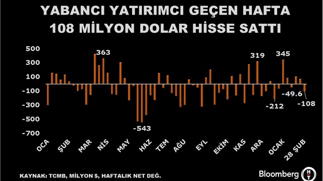 21 Şubat haftasında hem hisse hem de tahvilde sınırlı alım yapan yabancı, 28 Şubat haftasında hissede 108 milyon dolarlık satış yaptı.