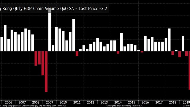 Hong Kong ekonomisi ikinci çeyrekte yüzde 0.4 daralmasının ardından bir önceki çeyreğe göre tekrar yüzde 3.2 daralarak 2009'dan bu yana en sert düşüşünü kaydetti ve teknik resesyona girdi.