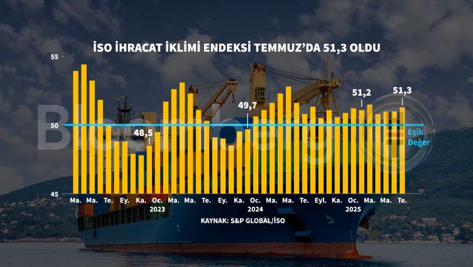 İstanbul Sanayi Odası (İSO) Türkiye İmalat Sektörü İhracat İklimi Endeksi temmuzda 51,3'e yükselerek dış talep koşullarında ılımlı bir iyileşmeye işaret etti. Söz konusu iyileşme Mart ayından bu yana en belirgin düzeyde gerçekleşti. Temmuz verisiyle birlikte ihracat ikliminde güçlenme eğilimi 19'uncu aya ulaştı.