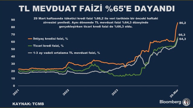 Bankacılık sektörünün toplam mevduatı, 29 Mart ile biten haftada önceki haftaya göre 91,8 milyar lira azalarak yaklaşık 15 trilyon 923,2 milyar liraya gerilerken faizlerde sert yükselişler izlendi. İhtiyaç kredi faizi yüzde 86'yı aşarak rekor yenilerken ticari kredi faizi yüzde 66'yı aştı. TL mevduat faizi de sert bir yükselişle yüzde 64'ü aştı.