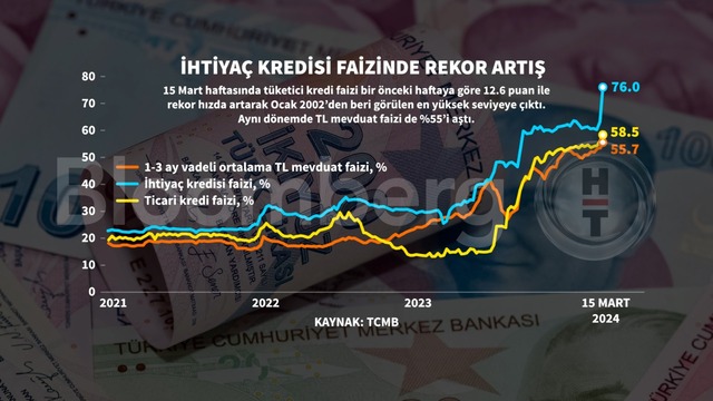 Haftanın rekorunu ise ihtiyaç kredi faizleri kırdı. İhtiyaç kredi faizleri 8 Mart haftasında yüzde 63,36 ile yıl başından bu yana gördüğü en yüksek seviyeyi 15 Mart haftasında yaklaşık 13 puan geride bırakarak yüzde 76'ya çıktı.