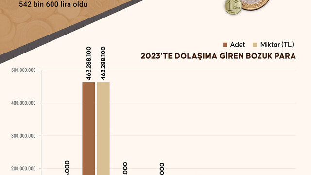 Verilere göre, 12 ayda 21 milyon 781 bin 200 adet 5 lira, 463 milyon 288 bin 100 adet 1 lira, 105 milyon 468 bin adet 50 kuruş, 105 milyon 788 bin adet 25 kuruş, 78 milyon 567 bin adet 10 kuruş, 6 milyon 120 bin adet 5 kuruş ve 480 bin adet 1 kuruş dolaşıma sunuldu.