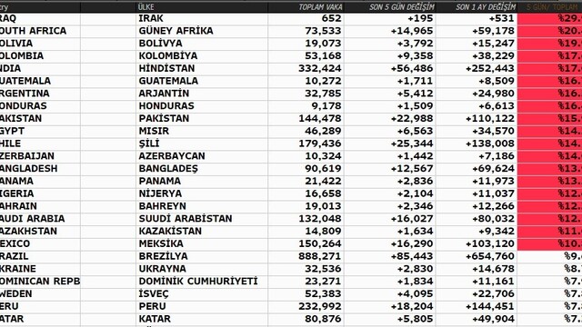 Latin Amerika’da da vaka sayılarının artış eğilimi devam ediyor. Guatemala, Arjantin, Honduras ve Şili’de 5 günlük vaka sayısının toplam vaka sayısına oranı %14-17 arasında değişiyor.