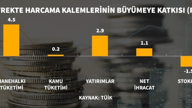 Bu rakamların ardından büyümeye en fazla katkının özel tüketimden geldiği görüldü. Katkı bazında özel tüketimi yatırımlar takip ederken, net ihracat katkısı 1,1 puanda kaldı. Devletin nihai harcamalarının katkısı ise yüzde 0,2 puan olarak kaydedildi.