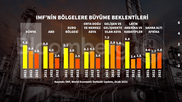 IMF 2022 küresel büyüme tahminini yüzde 4,9'dan yüzde 4,4'e indirdi. Fon, Türkiye'ye ilişkin 2022 ve 2023 büyüme tahminlerinde revizyon yapmadı. 2021 büyüme tahminini ise yüzde 9'dan yüzde 11'e yükseltti.