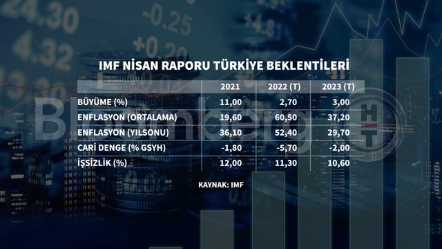 Kurum, Türkiye'nin 2022 yılı büyüme tahminini yüzde 3.3'ten yüzde 2.7'ye, 2023 tahminini yüzde 3.3'ten yüzde 3'e düşürdü. Türkiye için 2022 yılı TÜFE tahmini yüzde 60.5 olurken 2023 TÜFE tahmini yüzde 37.2 oldu.
