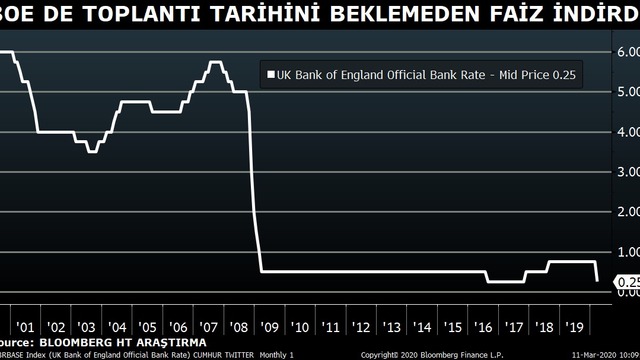 BoE, koronavirüsten ekonomisini korumaya çalışan Fed'i takip ederek, 2008 finans krizinden bu yana ilk kez politika faizinde 50 bp indirime gitti ve yüzde 0.25'e çekti.
