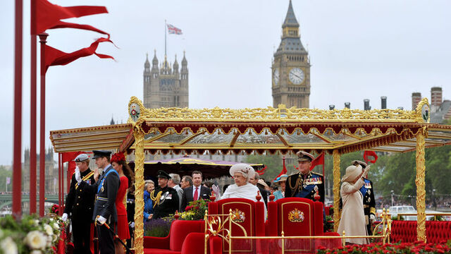 86 yaşındaki Kraliçe 2. Elizabeth, eşi Edinburgh Dükü Philip, oğlu Galler Prensi Charles ile eşi Cornwall Düşesi Camilla, torunu Cambridge Dükü William ile eşi Cambridge Düşesi Kate ve torunu Prens Harry kutlamalar için özel tasarlanan, Kraliçe'nin amblemiyle, kırmızı kadife ve rengarenk çiçeklerle süslenmiş görkemli kraliyet teknesiyle geçit törenine katıldı.