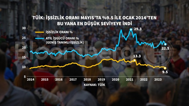 TÜİK verilerine göre işsizlik oranı Mayıs'ta 0,5 puan azalarak yüzde 9,5 seviyesine geriledi. Böylece işsizlik 2014'ten bu yana en düşük seviyede gerçekleşirken geniş tanımlı işsizlik ise yüzde 22,5 oldu.