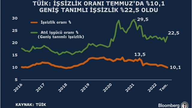 TÜİK verilerine göre, mevsim etkisinden arındırılmış işsizlik oranı yüzde 10,1 seviyesinde gerçekleşti. Haziran ayı verisi yüzde 10,4 olarak kaydedilmişti. Geniş tanımlı işsizlik ise (atıl işgücü) Temmuz'da yüzde 22,5'e yükseldi. Önceki veri yüzde 20,5 olarak izlenmişti. Genç nüfusta işsizlik oranı bir önceki aya göre 0,8 puanlık azalış ile yüzde 19,1 oldu.