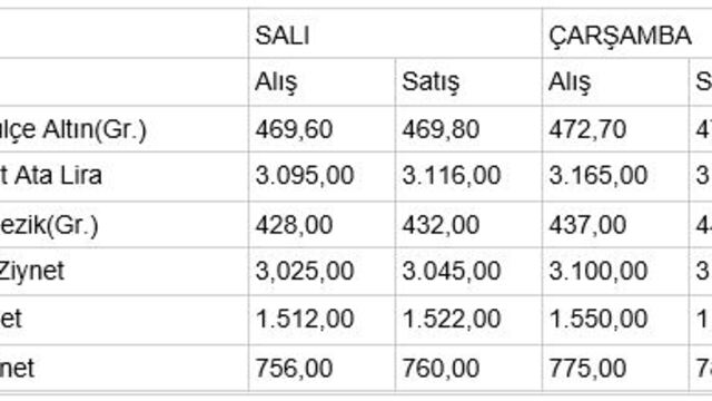 İstanbul Kapalıçarşı'da alınıp satılan altın türlerinin, önceki kapanış ve bugün açılış fiyatları (TL) şöyle: