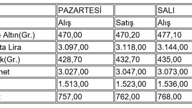 İstanbul Kapalıçarşı'da alınıp satılan altın türlerinin, önceki kapanış ve bugün açılış fiyatları (TL) şöyle: