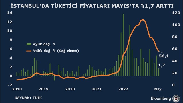 2022 Mayıs ayına göre 2023 Mayıs ayında yaşanan fiyat değişimlerini gösteren bir önceki yılın aynı ayına göre değişim oranı İstanbul Ticaret Odası'nın (İTO) 1995 bazlı Ücretliler Geçinme İndeksinde yüzde 56,05, Toptan Eşya Fiyatları İndeksi'nde ise yüzde 70,33 olarak gerçekleşti.