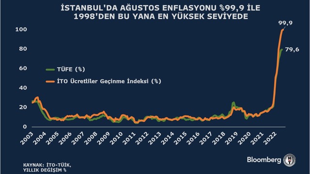 • İstanbul Ticaret Odası (İTO) Ağustos ayına ilişkin perakende ve toptan fiyat endekslerini yayımladı. Buna göre İstanbul'da perakende fiyatlar yıllık yüzde 99,91 ile 1998'den beri en yüksek hızda arttı. Önceki ay artış yüzde 99,1 olmuştu. Toptan fiyatlar da yıllık bazda yükselişini sürdürerek yüzde 98,09 arttı.