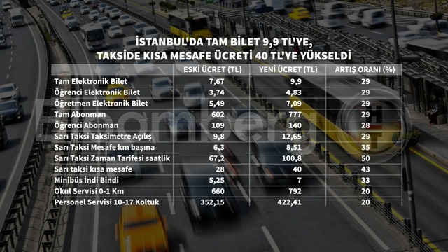 İstanbul'da toplu taşımaya yapılan zamla birlikte tam bilet ücreti 9,90 TL, öğrenci bilet ücreti 4,83 TL, tam abonman ücreti 777 TL, öğrenci abonman ücreti 140 TL oldu.