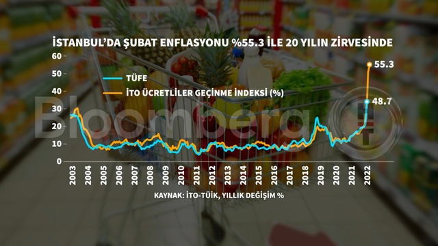 İstanbul'da perakende fiyatlarda yıllık enflasyon Şubat'ta yüzde 55,32 seviyesine çıktı.