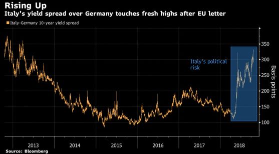Yatırımcı riski açısından önemli bir gösterge olan 10 yıl vadeli İtalya ve Almanya hazine tahvilleri arasındaki faiz farkı, Avrupa Komisyonu'nun Roma hükümetine yönelik kaleme aldığı eleştirel mektubun ardından beş yıldan uzun bir sürenin zirvesini gördü.