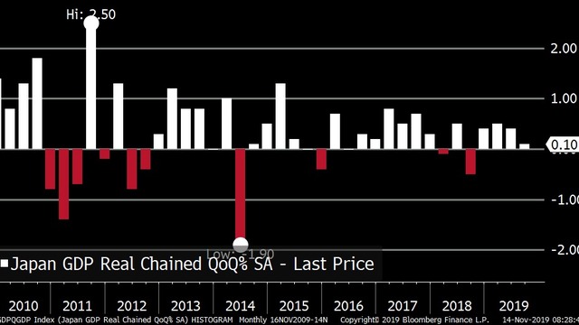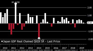 Japonya'da Kabine Ofisi tarafından Perşembe günü yapılan açıklamaya göre GSYHİ Eylül'de biten üç aylık sürede bir önceki çeyreğe göre yıllıklandırılmış olarak yüzde 0.2 büyüdü. Nisan – Haziran dönemindeki büyüme revize edilmiş olarak yüzde 1.8 idi. Ekonomistlerin 3. çeyrek tahmini yüzde 0.9 idi.
