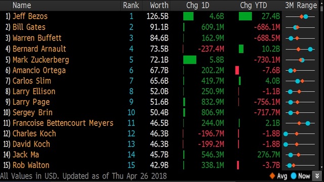 Bezos, 26 Nisan itibariyle 126.5 milyar dolarlık servetiye dünyanın en zengin insanı konumunda bulunuyor. Bununla birlikte Bezos, 100 milyar doların üzerinde net servete sahip tek kişi.