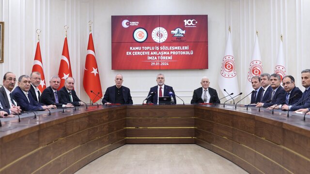 Çalışma ve Sosyal Güvenlik Bakanlığı koordinasyonunda, Türk-İş ve Hak-İş ile Türk Ağır Sanayii ve Hizmet Sektörü Kamu İşverenleri Sendikası (TÜHİS) arasında "Kamu Toplu İş Sözleşmeleri Ek Çerçeve Anlaşma Protokolü" imzalandı.