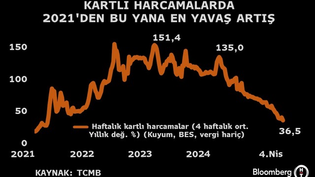 Bloomberg HT'nin Türkiye Cumhuriyet Merkez Bankası (TCMB) verileri üzerinden yaptığı hesaplamaya göre kartlı harcamalarda 4 haftalık ortalamanın yıllık değişimi 4 Nisan haftasında yüzde 36,5 olarak kaydedildi.