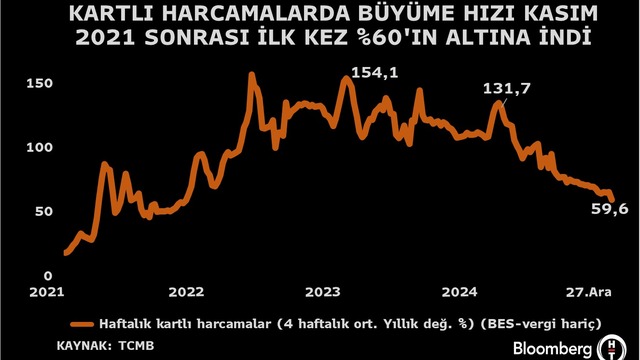 Böylelikle kartlı harcamalarda büyüme 2021'den sonra ilk kez yüzde 60'ın altına geldi. Kartlı harcamalarda büyüme 2023 yılında yüzde 154 ile zirve seviyeleri görmüştü. Para politikasında sıkı duruşun geçerli olduğu 2024 yılında da kartlı harcamalarda büyüme yüzde 131'in üzerinde gerçekleşmişti.